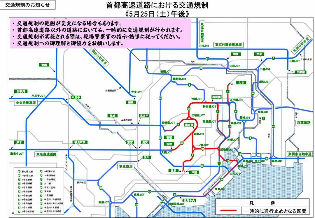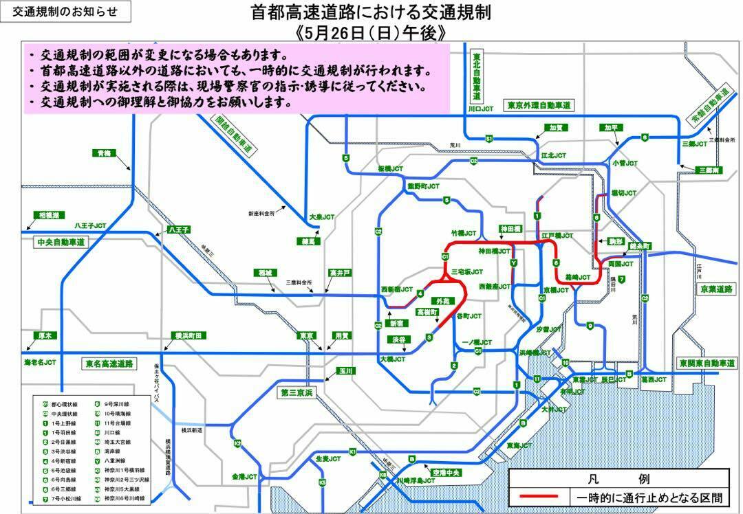 - 首都高速道路以外の道路においても、一時的に交通規制が行われます。